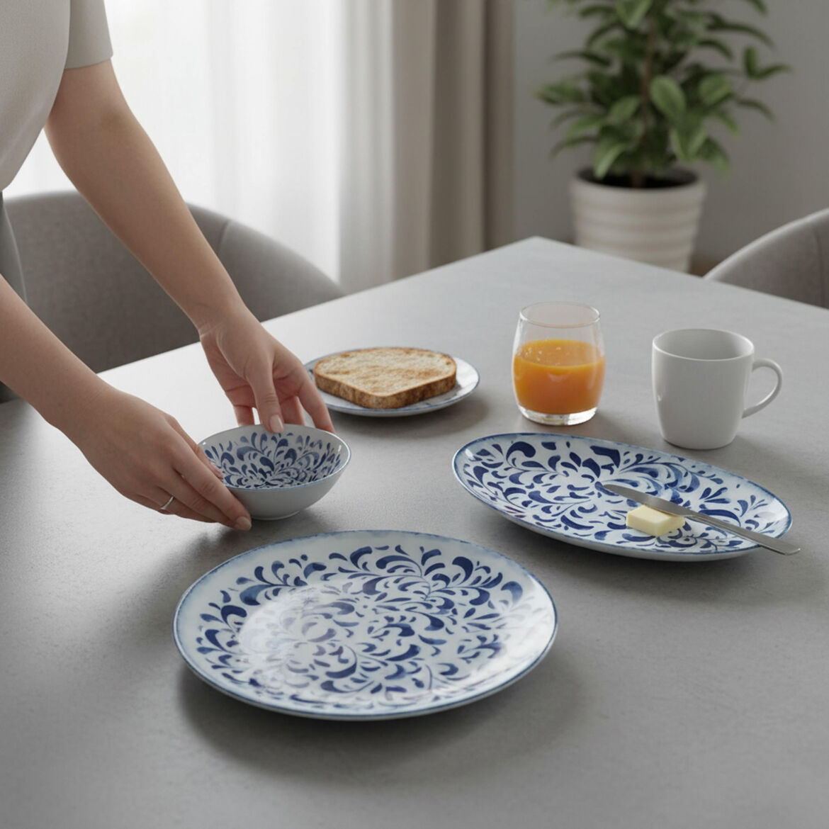 Mavi-beyaz motifleriyle öne çıkan bu 4 kişilik yemek takımı, zamansız tasarımı sayesinde her dönem kullanılabilecek bir şıklık sunar. Günlük sofralarda da özel davetlerde de aynı uyumu ve ferahlığı sağlayarak masanıza düzenli ve özenli bir görünüm kazandırır.