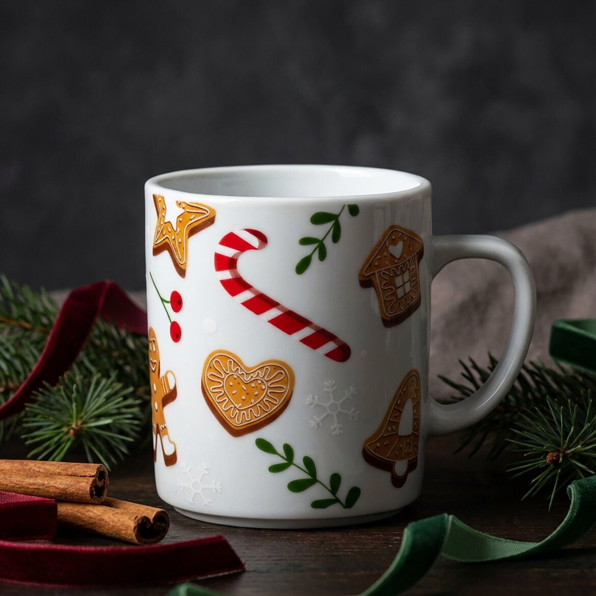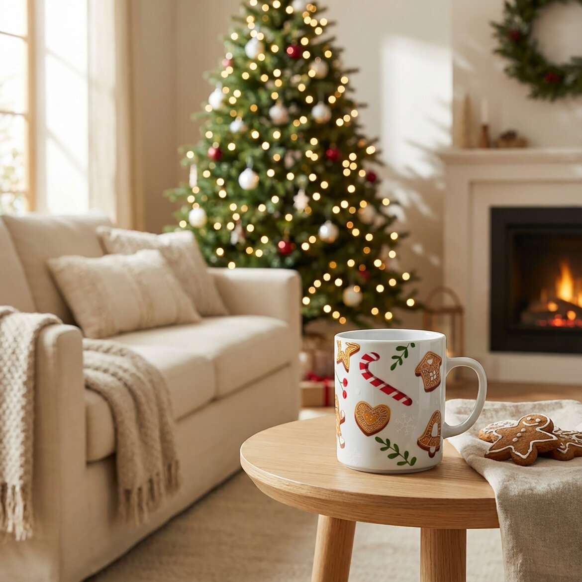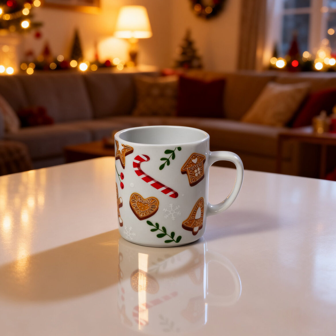 Sıcak içecek kupaları, zencefilli kurabiyeler ve yılbaşı motifleriyle süslenen bu eğlenceli mug, kış mevsiminin en keyifli anlarını masanıza taşır. Neşeli deseni sayesinde çalışma masanızda dekor olarak kullanılabilir; aynı zamanda kahve ve çay saatlerinize tatlı bir yılbaşı ruhu sunar.