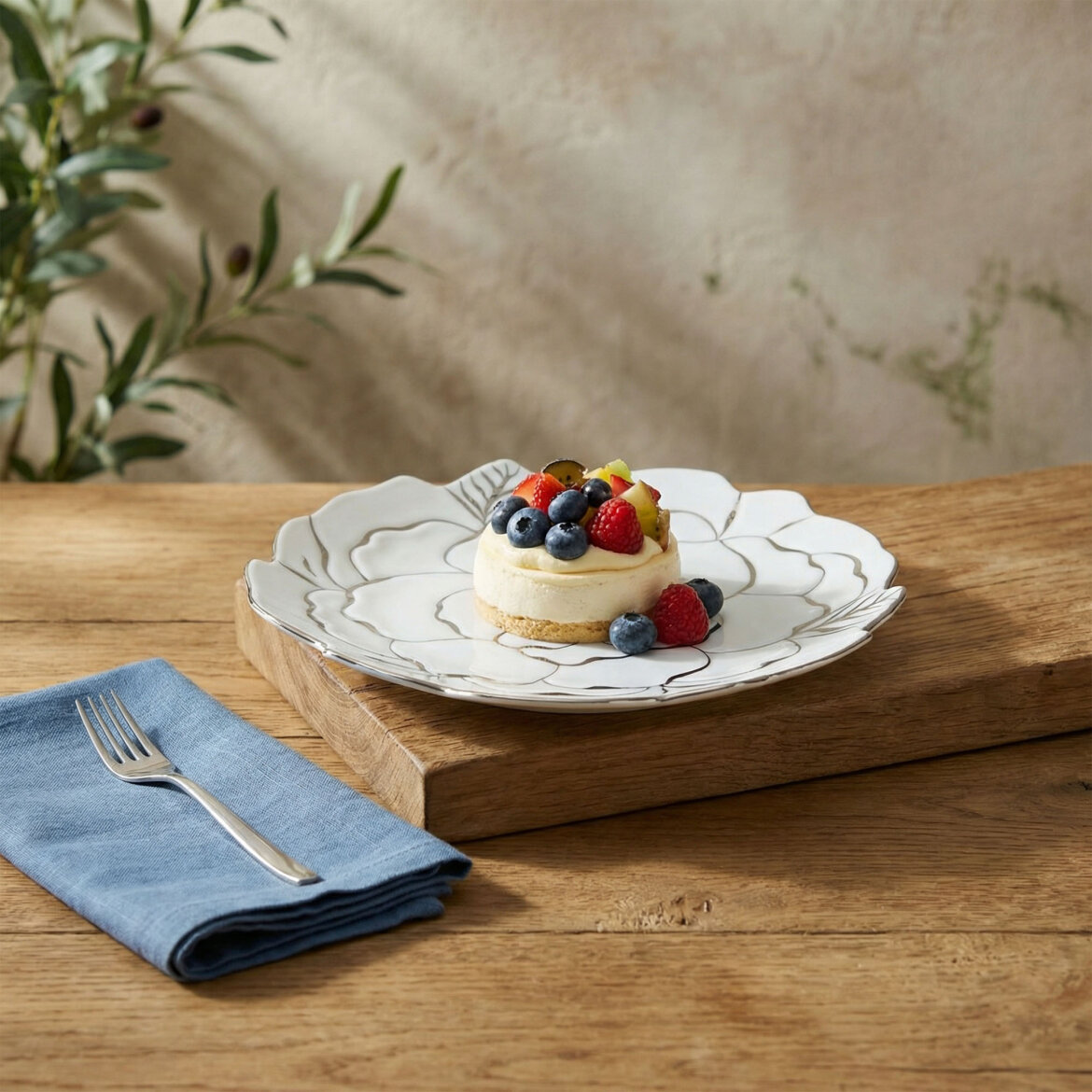 El dekoru ile süslenmiş çiçek formundaki porselen dekoratif tabak, zarif ve yaldızlı detaylarıyla bulunduğu ortama estetik bir hava katar. Katmanlı çiçek deseni ve el işçiliği dokunuşları sayesinde her parça özgün bir görünüm sunar.