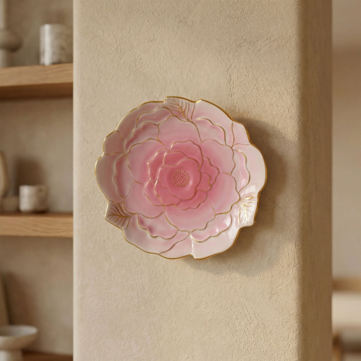 El dekoru ile süslenmiş çiçek formundaki porselen dekoratif tabak, zarif ı ve altın yaldızlı detaylarıyla bulunduğu ortama estetik bir hava katar. Katmanlı çiçek deseni ve el işçiliği dokunuşları sayesinde her parça özgün bir görünüm sunar.