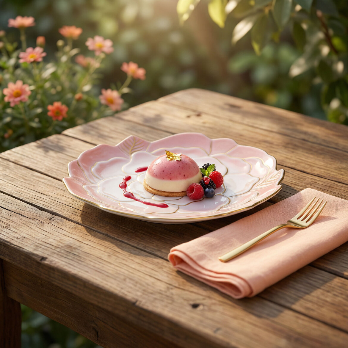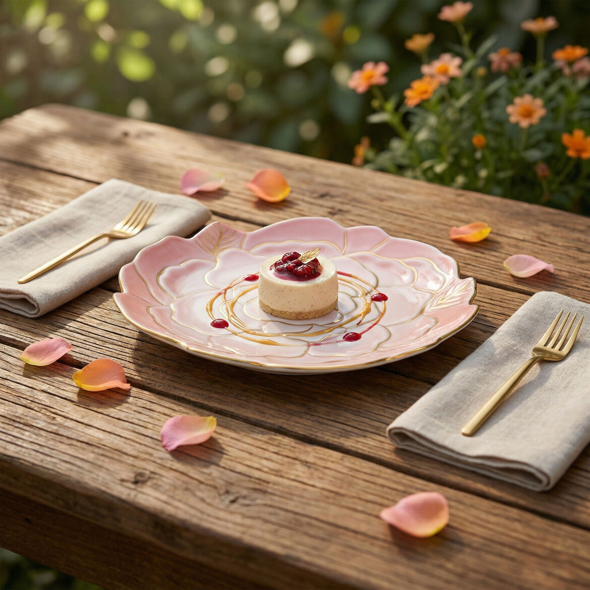 El dekoru ile süslenmiş çiçek formundaki porselen dekoratif tabak, zarif ı ve altın yaldızlı detaylarıyla bulunduğu ortama estetik bir hava katar. Katmanlı çiçek deseni ve el işçiliği dokunuşları sayesinde her parça özgün bir görünüm sunar.